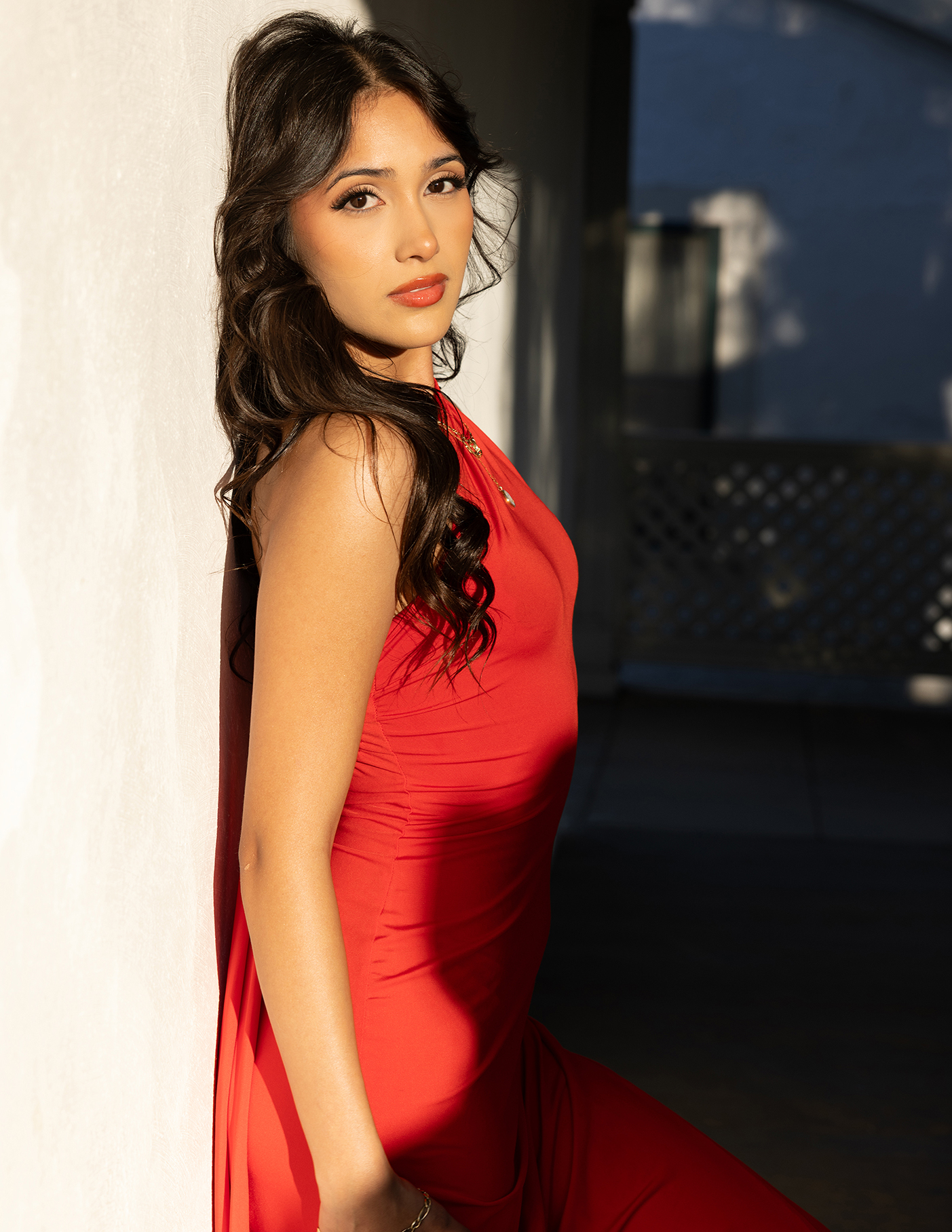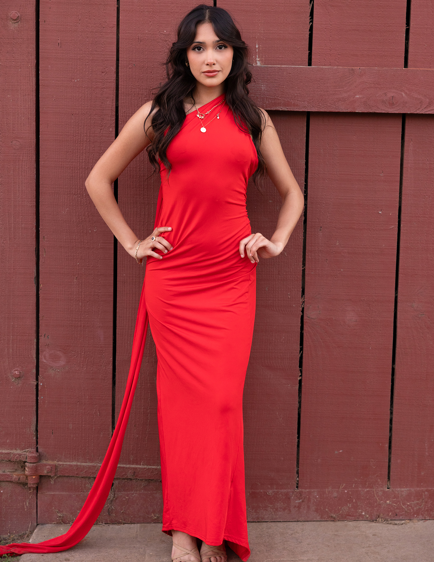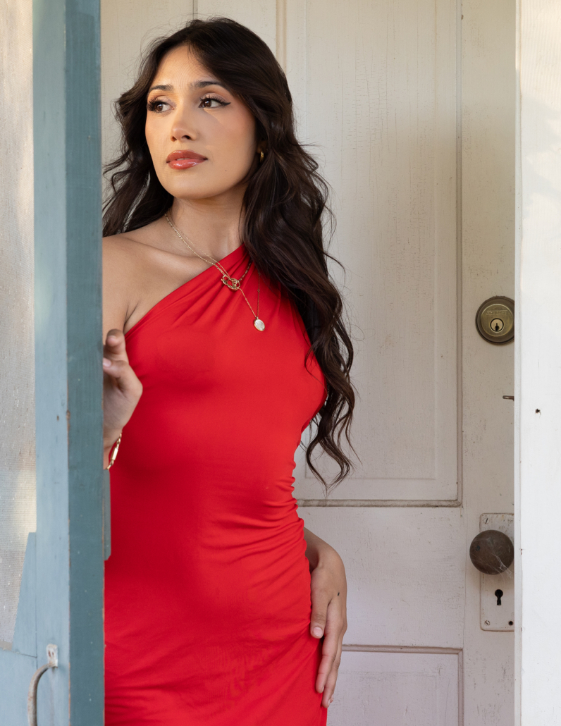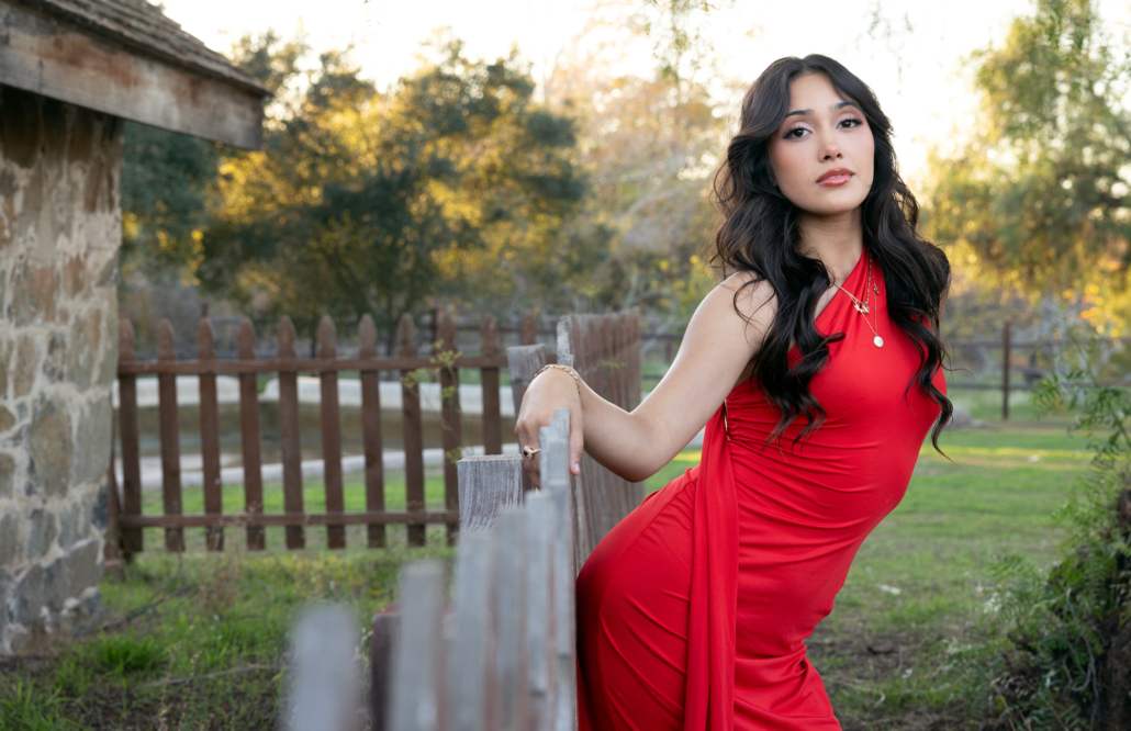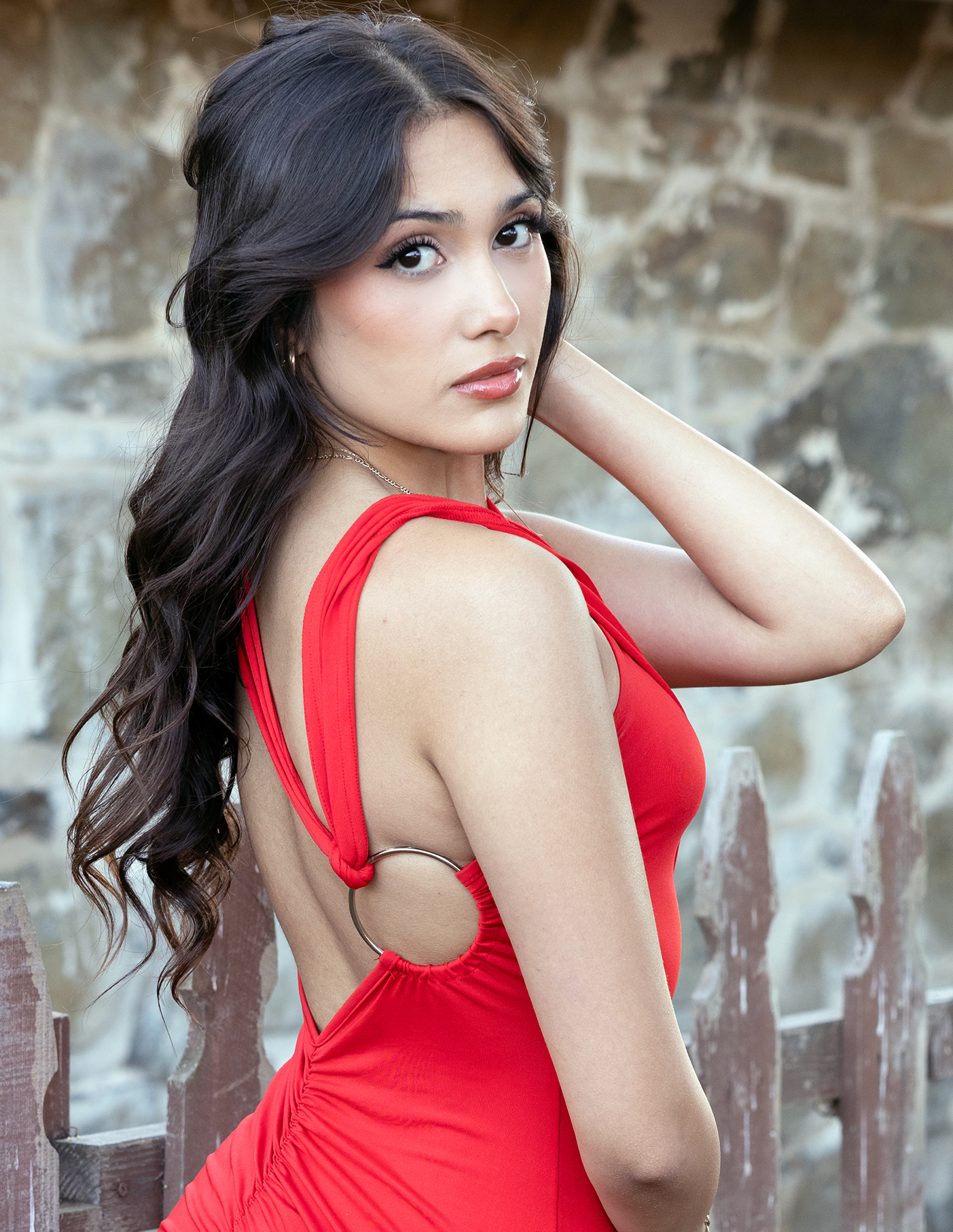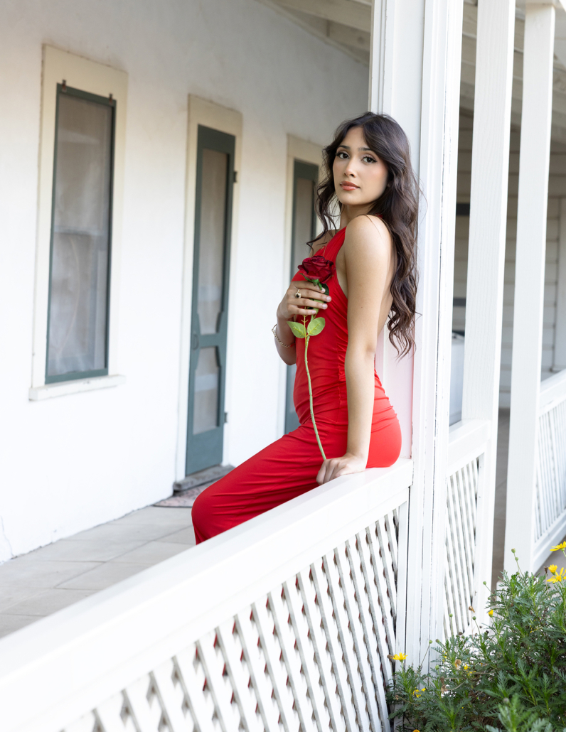 She arrives in a red dress, and the old ranch lifts its gaze. Up the stairs, and against ancient railings, rock walls and white-washed lattice. The past remains whole, while the present passes through, offering life, leaving respect, and lifting spirit.