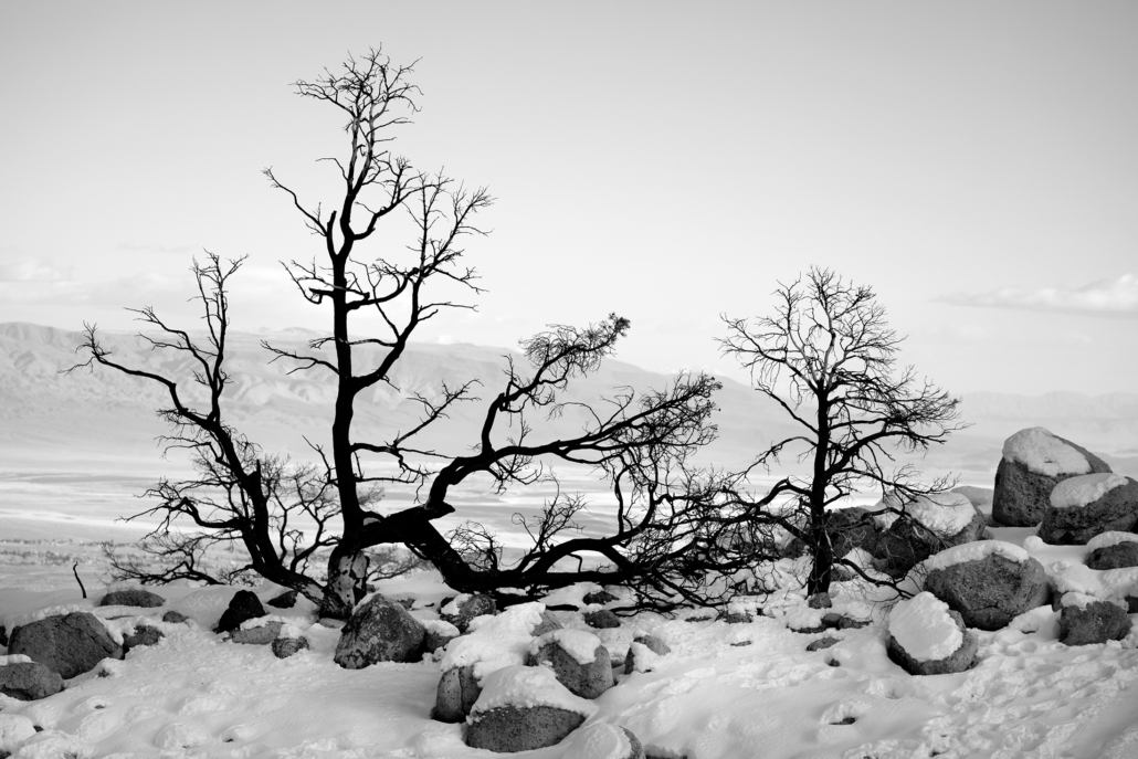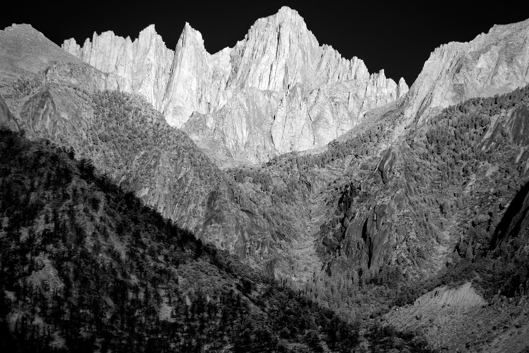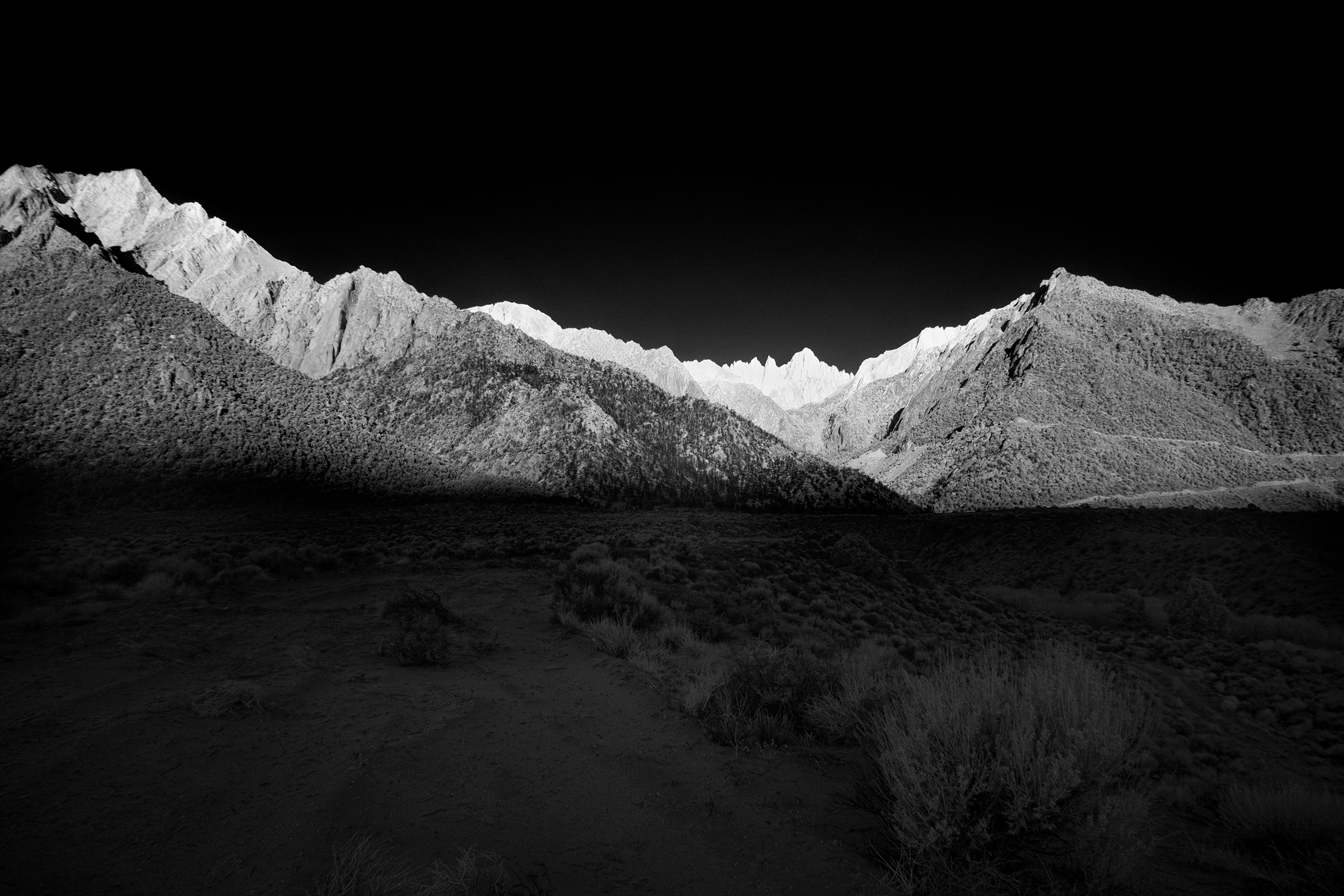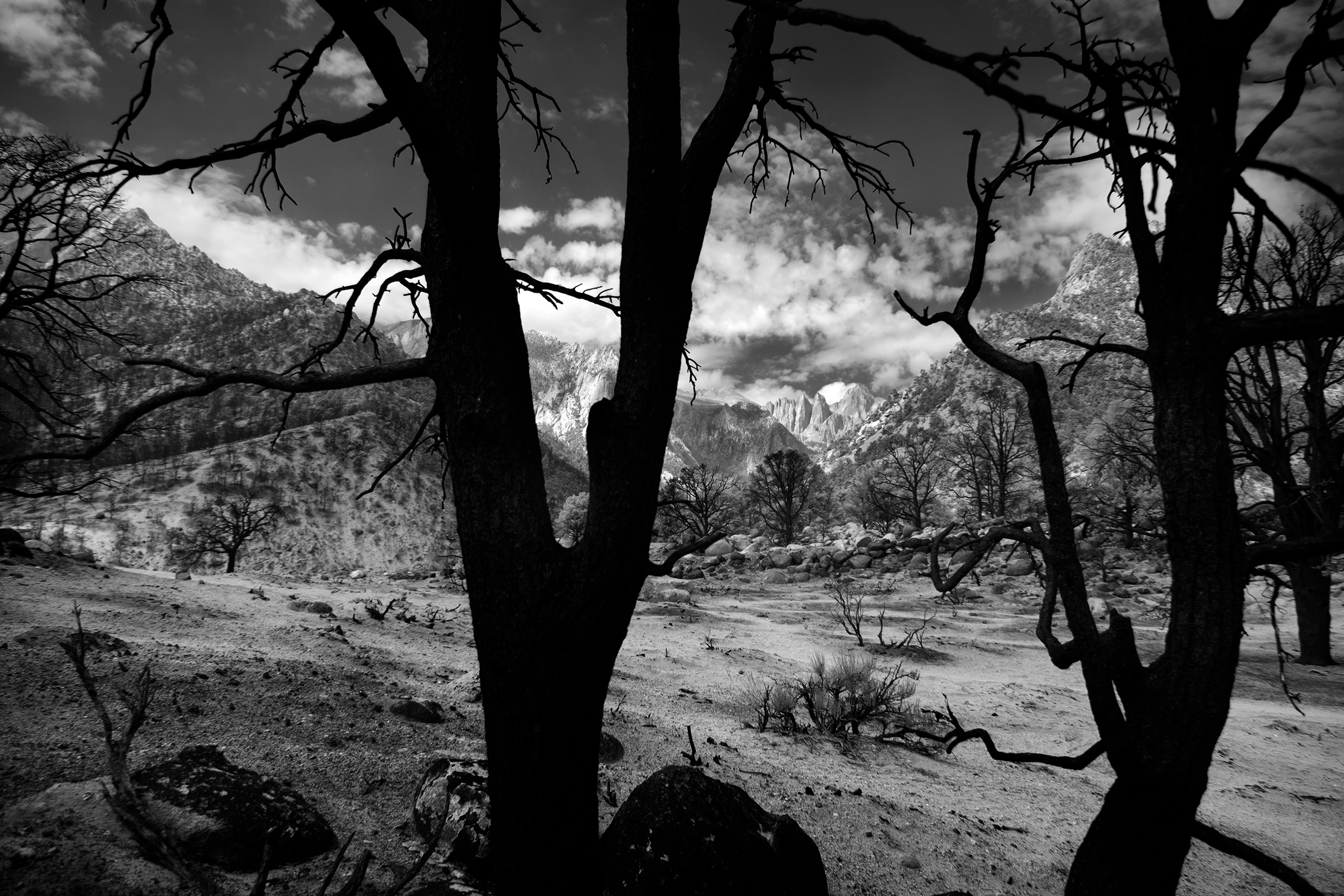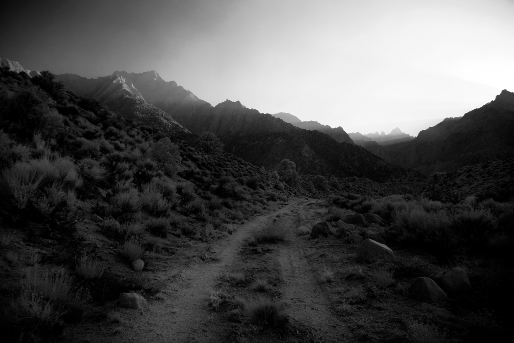 The tallest mountain in the lower 48 United States has been standing tall for millions of years. Mt Whitney – California. It may not seem to change much since formed by violent volcanic activity, but as I found out, Whitney Portal can dramatically alter its appearance. Each day, each year, and each century bring dramatic fluctuations that spotlight and obscure different vistas, peaks, valleys and intimate scenes. Sunrise, sunset, winter, summer and a 100 year fire presented totally unique experiences in one of Americas highest spaces. This was a single journey three years in the making. Captured in infrared and black and white, it is a study derived from a heightened curiosity to capture the same famous place across multiple visits and enjoy the different moods and the ever-changing personalities. A single wide open western U.S. adventure layered across three trips to Whitney.