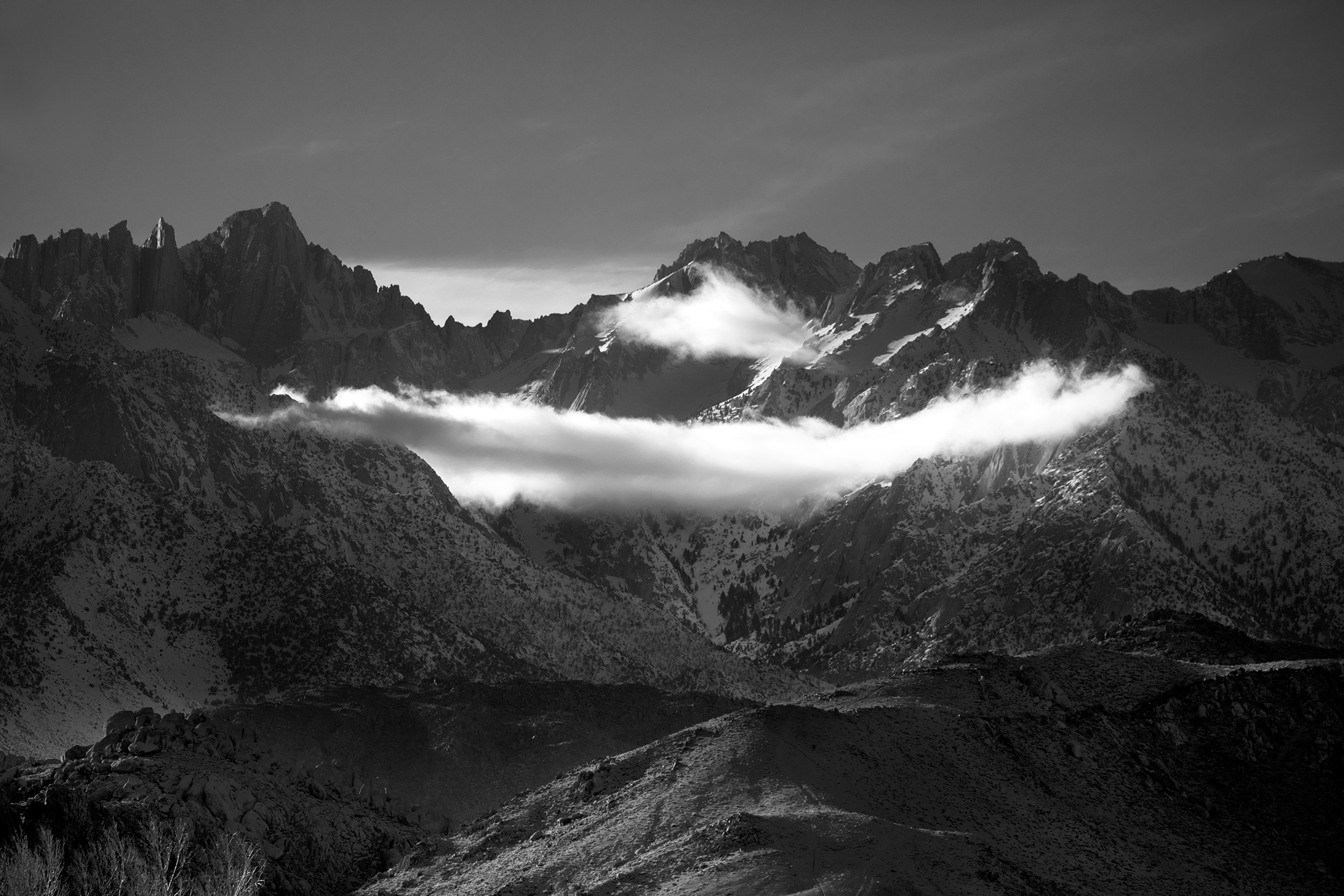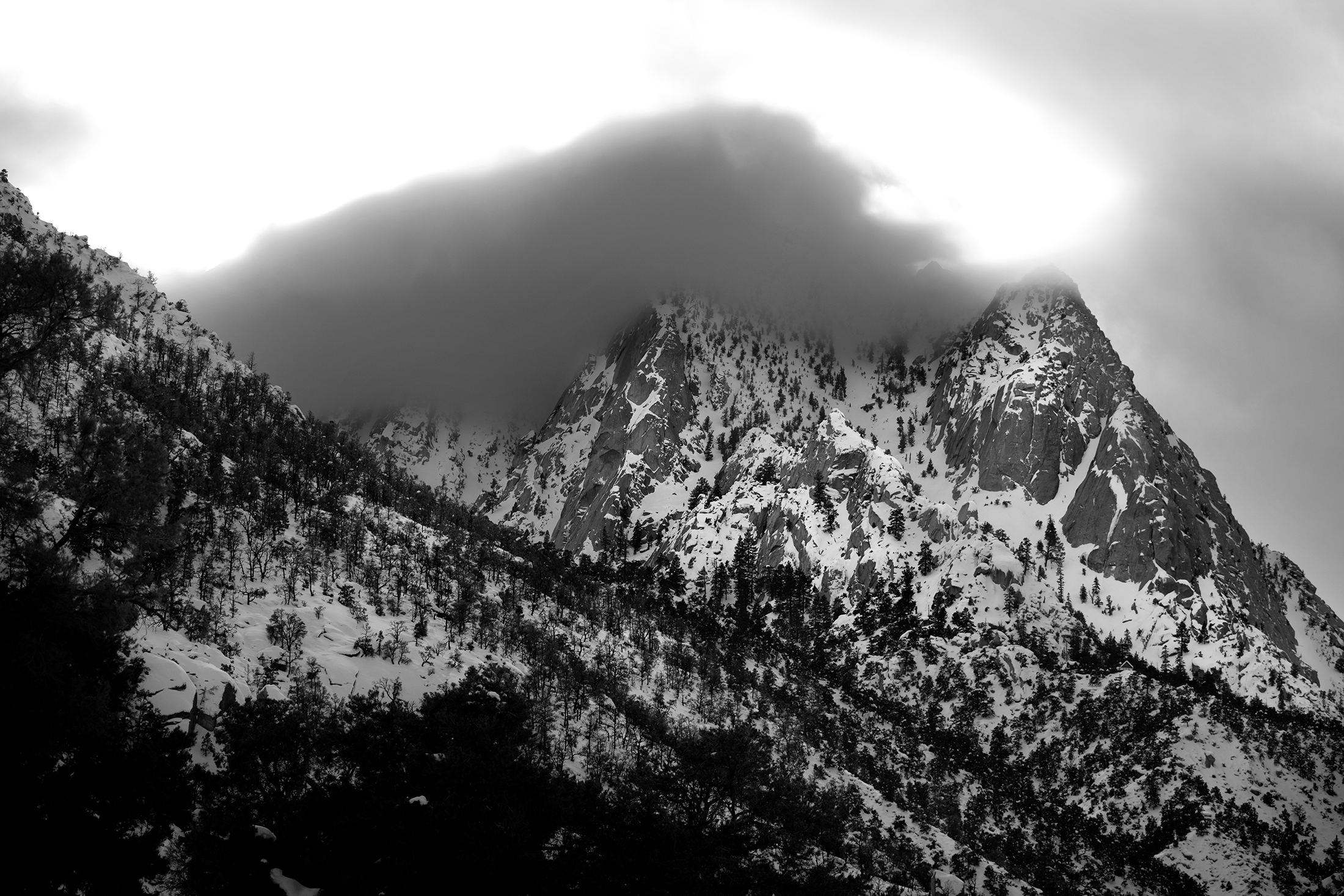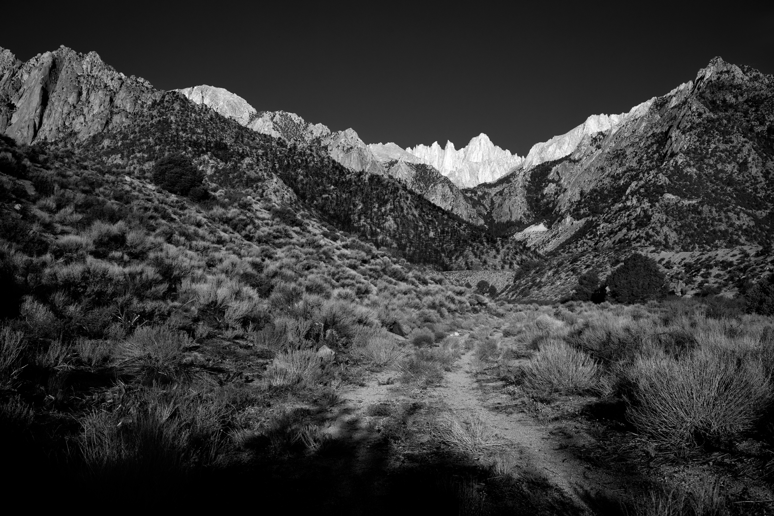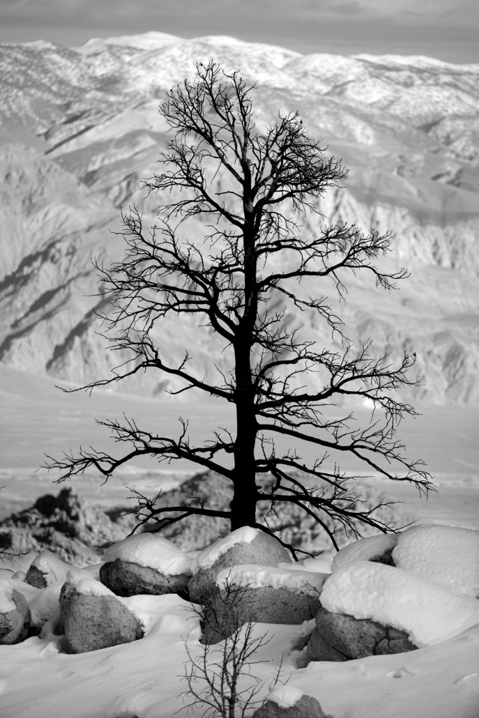 The tallest mountain in the lower 48 United States has been standing tall for millions of years. Mt Whitney – California. It may not seem to change much since formed by violent volcanic activity, but as I found out, Whitney Portal can dramatically alter its appearance. Each day, each year, and each century bring dramatic fluctuations that spotlight and obscure different vistas, peaks, valleys and intimate scenes. Sunrise, sunset, winter, summer and a 100 year fire presented totally unique experiences in one of Americas highest spaces. This was a single journey three years in the making. Captured in infrared and black and white, it is a study derived from a heightened curiosity to capture the same famous place across multiple visits and enjoy the different moods and the ever-changing personalities. A single wide open western U.S. adventure layered across three trips to Whitney.